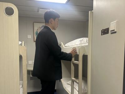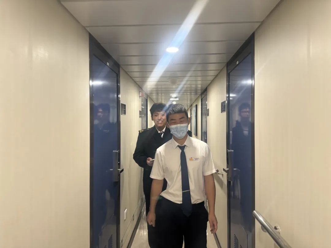在我校国际邮轮乘务专业、现“祥龙岛”轮工作的优秀毕业生引导下,学生代表分别参观了汽车仓、客房、餐厅、娱乐设施、甲板、驾驶台、救生设备等,对上课所学的客滚船的整体布局和环境有了更加直观的认识和了解。