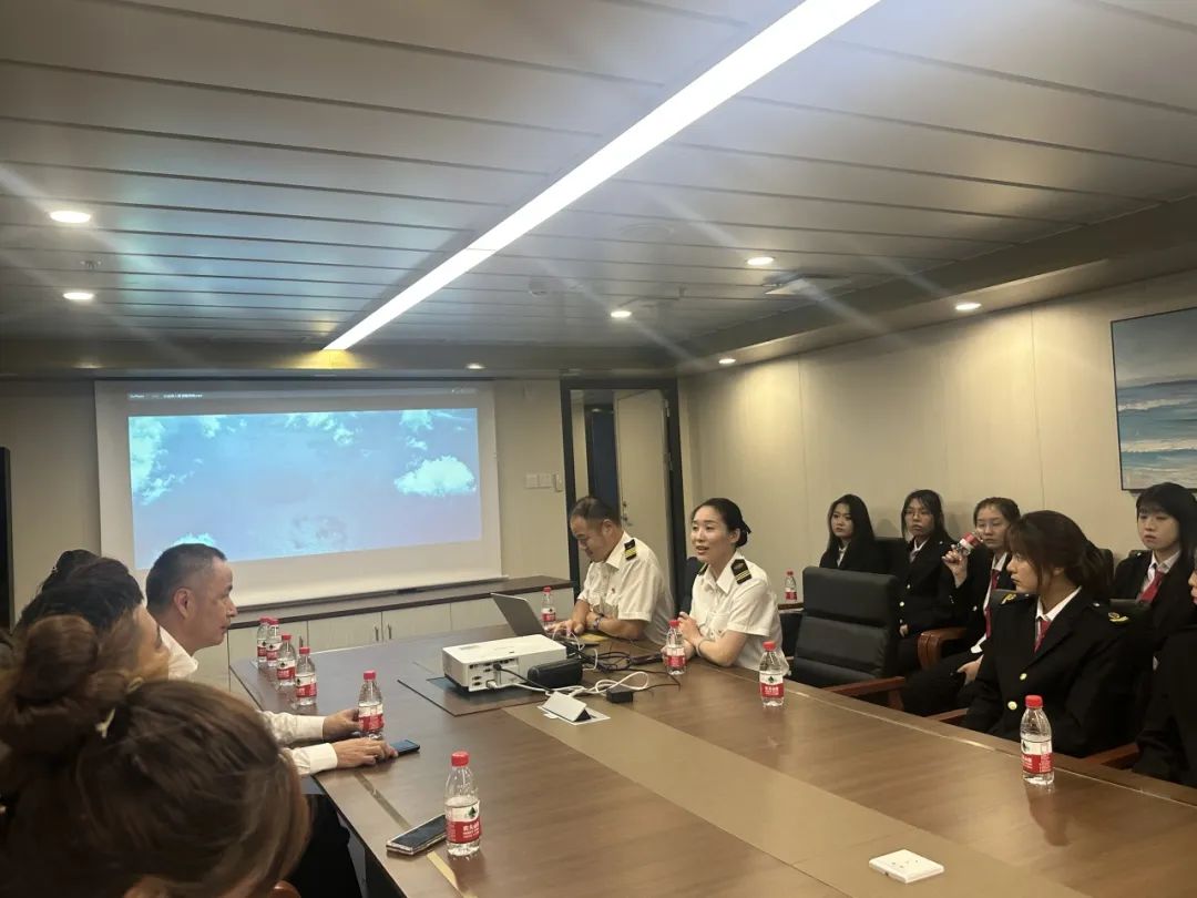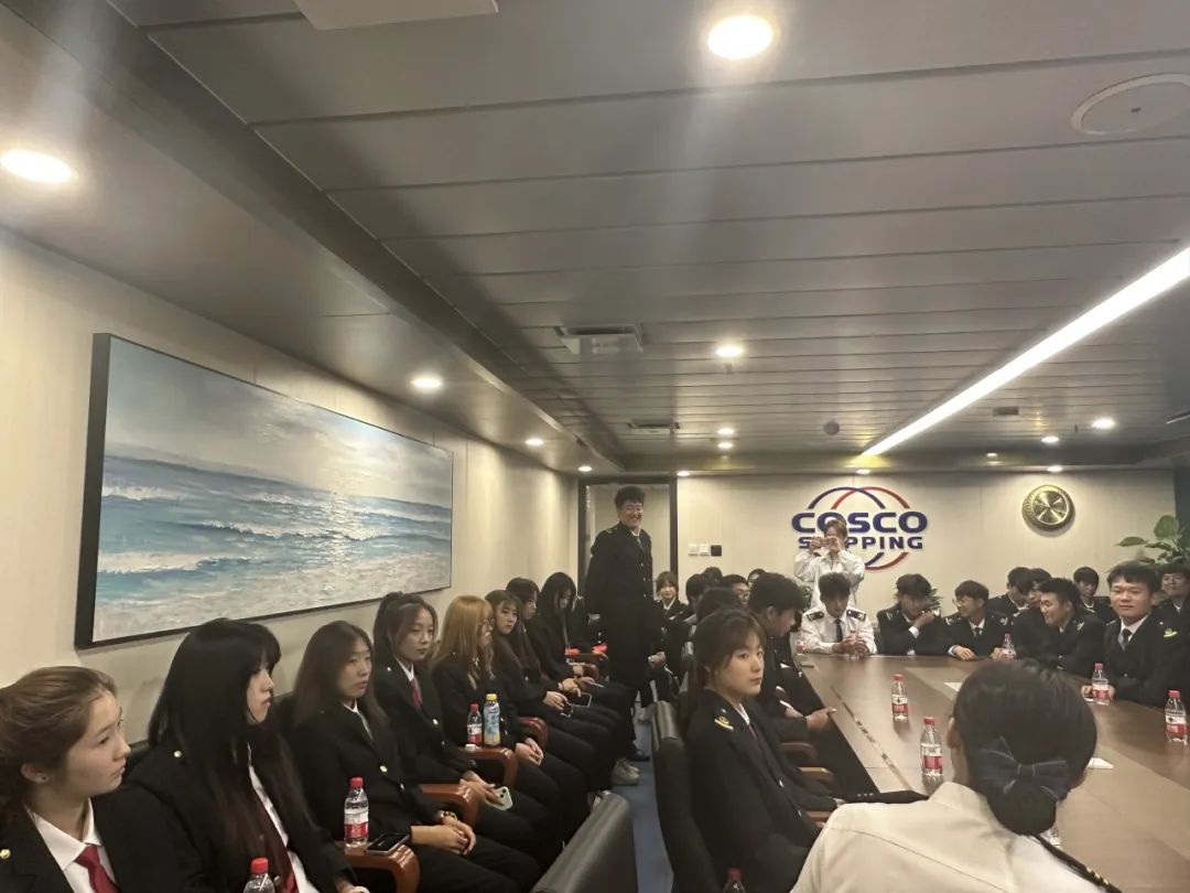 随后,船东代表“祥龙岛”轮政委马崇洋、客运经理刘永波、浩海国际船舶管理(大连)有限公司总经理马连新、张伟林副校长、就业指导中心王洋主任、航海学院教师、在船毕业生与学生们进行了座谈。政委马崇洋作为船东代表对我校国际邮轮乘务订单班毕业生的专业能力和职业素养给出了极高的评价,对在校生上船参观表示热烈欢迎,并且非常希望未来能有更多的学生选择留船实习就业,同时播放了中远海运客运公司宣传片。客运经理刘永波详细介绍了在船期间的工作内容以及工作模式。浩海国际船舶管理(大连)有限公司马连新总经理介绍目前中远海运客运公司对船员人才的需求以及薪资待遇等。我校张伟林副校长代表学校向“祥龙岛”号轮的各位领导表示感谢,首先感谢“祥龙岛”号轮的各位领导为我校师生提供上船参观学习的机会,同时鼓励学生努力学习为将来就业打下良好基础。王洋主任表示就业指导中心将为学生就业做好服务,为企业提供符合企业标准的可用之才。在船毕业生和学弟学妹分享了在船工作的感受,使得在校学生对未来工作有了更加清晰的认知,为日后更快的适应工作岗位奠定了基础。