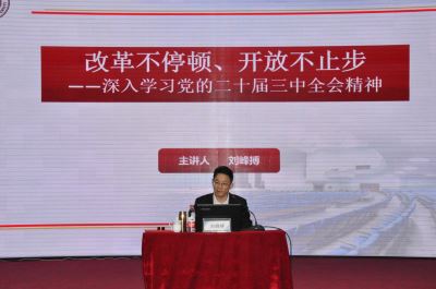 刘峰搏教授以《改革不停顿、开放不止步——深入学习党的二十届三中全会精神》为题,从“充分认识和理解党的二十届三中全会的重大意义”“深刻理解党的二十届三中全会《决定》的主要内容与精神实质”“凝心聚力 奋发进取 全面贯彻落实党的二十届三中全会精神”三个方面,深刻阐释了党的二十届三中全会的丰富内涵和精神实质。整场讲座通过详实精准的数据和鲜活生动的案例,深入浅出,旁征博引,清晰展现出辽宁改革发展的优势和方向,让与会师生深刻感受到辽宁振兴的必要性和紧迫性,激发干事创业的积极性、主动性、创造性,为凝心聚力谋划学校改革与发展奠定思想基础。